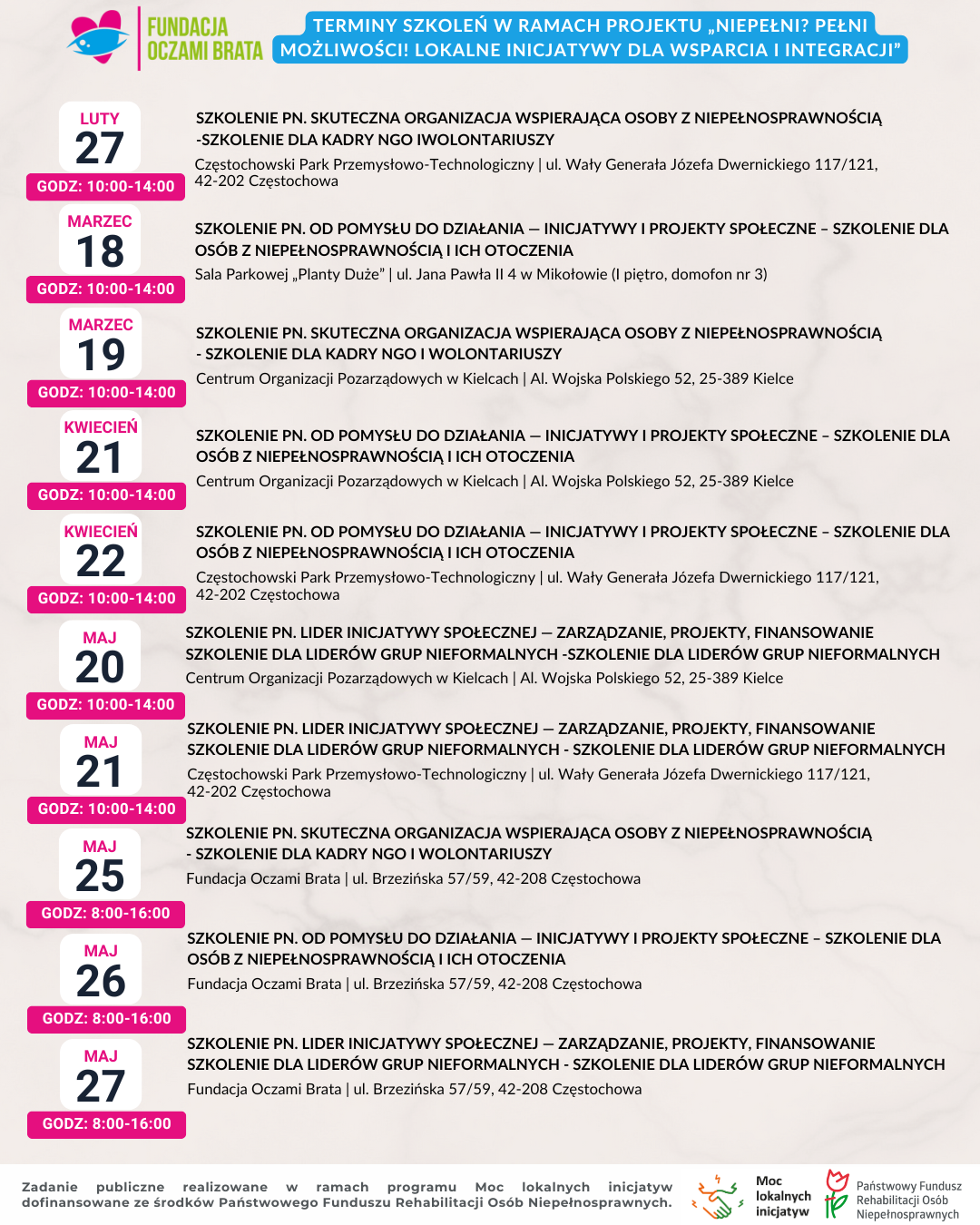 Fundacja Oczami Brata zaprasza osoby z niepełnosprawnością, ich rodziny i otoczenie, kadrę NGO, wolontariuszy oraz lokalnych liderów społecznych na bezpłatny cykl szkoleń w ramach projektu finansowanego ze środków Państwowego Funduszu Rehabilitacji Osób Niepełnosprawnych (PFRON) w programie „Moc Lokalnych Inicjatyw”.