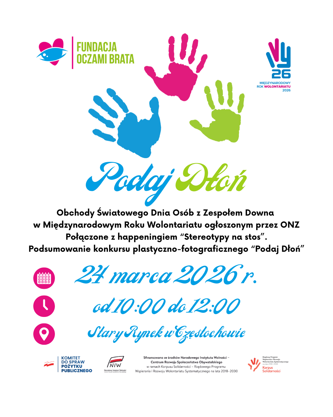 - 24 marca 2026 r. → uroczyste ogłoszenie wyników i wręczenie nagród podczas obchodów Światowego Dnia Osób z Zespołem Downa na Starym Rynku w Częstochowie